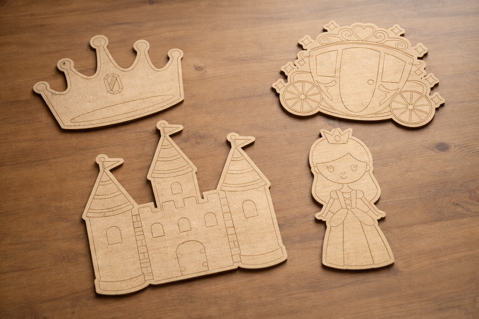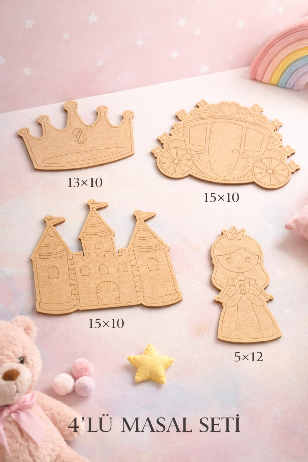 Kız çocuk odaları için özel tasarlanmış bu 4’lü Masal Seti, prenses, şato, at arabası ve taç figürlerinden oluşur. Doğal ham MDF malzemeden üretilmiştir ve tamamen boyanabilir yapıdadır. Çocukların hayal gücünü geliştiren, el becerilerini destekleyen eğlenceli bir aktivite ürünüdür.